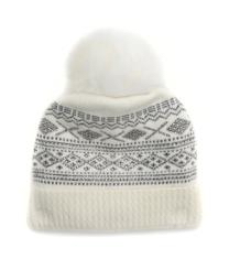 Шапка для девочки молочного цвета с декоративным орнаментом черного цвета, с белым помпоном из натурального меха. двойная вязка 65%-шерсть,35%-хлопок