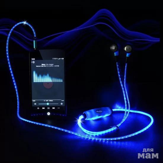 Наушники идеальны для любителей слушать музыку, гуляя по вечернему или ночному городу и при этом выделяться из толпы. Они обладают полупрозрачными корпусом и кабелем, в которые встроены яркие светодиоды зеленого или синего цвета. Причем светятся аксессуары не просто так, а в такт прослушиваемой в текущий момент музыке. Вторая полезная фишка - это встроенная гарнитура. Кроме того, они отлично подойдут ночным бегунам, чтобы на тех случайно не наехала машина или велосипед.