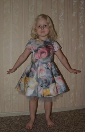 На каталожном фото платье выше колен.Мне кажется оно так и задумано.На вашей доченьке очень красиво смотрится.