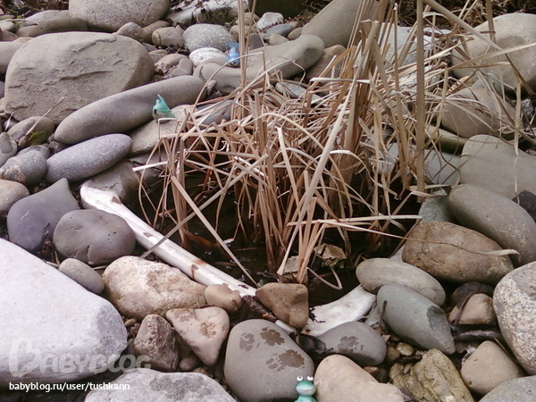 Ну пруд сильно сказано)))) Обложила я прошлой весной раковину камушками, налила воды и вот он. А внутри растет камыш! Сейчас он конечно сухой, осенью я ничего не обрезала, скоро обрежу сухие части, и как потеплеет, он снова начнет расти))) И раковинку снова обложить камушками, кот все поскидывал внутрь)))