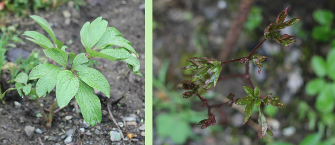 Еще в моей коллекции пионов есть два странных индивида, насколько я помню, оба они относятся к травянистым пионам. Один вообще уникум, я его называю "пион с суициидальными наклонностями" (по анологии с золотой рыбкой Амели). Купила я его замученным полумертвым корневищем, но к моему удивлению, посаженный осенью, весной он дал листы, простоял до середины лета и отмер до корня. Думаю ладно, такова его судьба. Но, к моему удивлению, так продолжается уже три года, каждый год листья сохраняются чуть подольше, но цвести так и не сподобился. Второй куплен в прошлом году, высажен весной, в середине лета засох, а этой весной опять вылез. Я понимаю, что травянистые пионы у нас в лесу так себя и ведут, но чего ж они, заразы, не цветут-то??? С темными побегами это как раз "суициидальный")))
