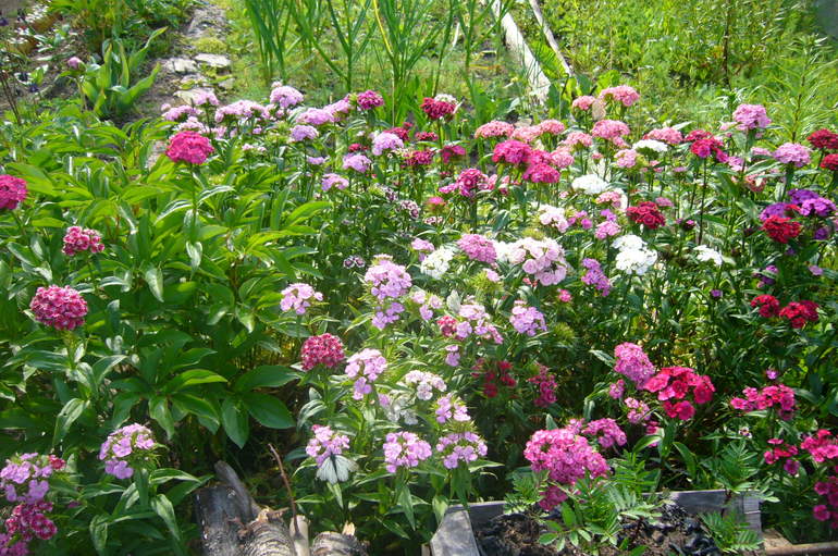 ДвухлетникиВот такая красота расцвела у меня на участке. Смотрю и насмотреться не могу никак, решила тут хвастануть!!! Это турецкая гвоздика,вроде бы цветочки простенькие, а красота неописуемая!!! Взгляд так и притягивает этот уголок участка. Такое буйство красок!