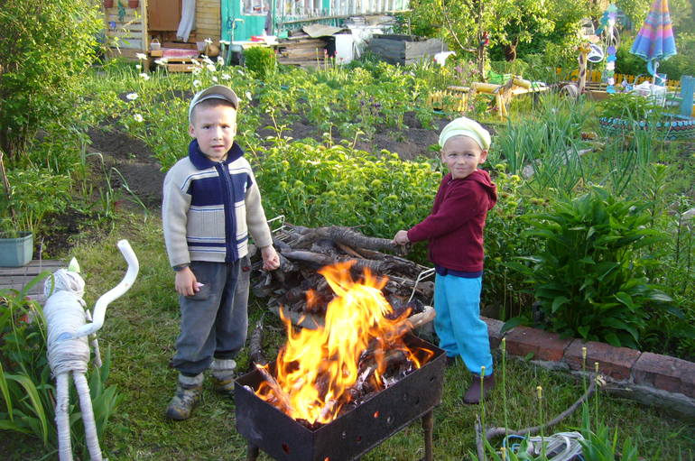 А тут этот же уголок где-то неделю назад, когда мои цветочки еще не расцвели.Цветочки находятся за спинами моих шашлычников.)))