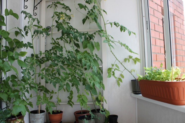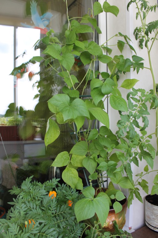 фасоль, сажаю каждый год разную. Эта цветет мелкими, кораллового цвета, цветочками на большой кисти. Красиво, но быстро) И, конечно, ей мало солнца. С боку у окна растет фасоль сорта "долихос", но ее почти не видно среди помидоров. Она скорее всего не зацветет.