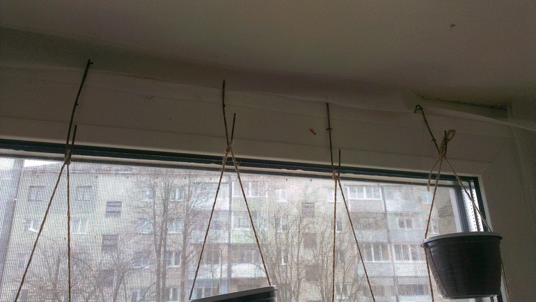 Поотрезала им "ручки", раскаленной спицей сделала дырочки с двух сторон каждого стаканчика, продела их на бечеву, под каждым провязывая узелок, и вот таким образом повесила на окно. Крючки согнули из обычной проволовки;))) Ну а шишечки-листочки - это я...увлеклась немного))))