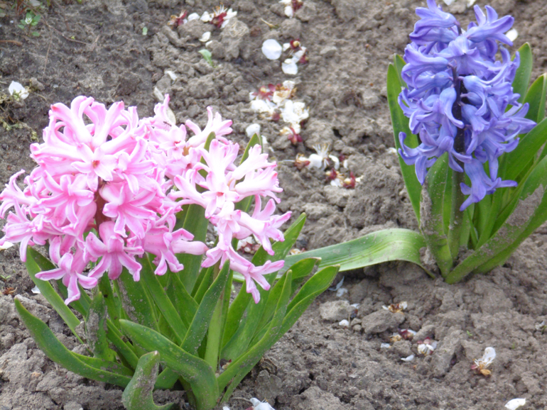 Гиацинты таких 5 шт. 2 розовых и 3 синих. Розовые только распустились, синие уже отцветают. Чего так??