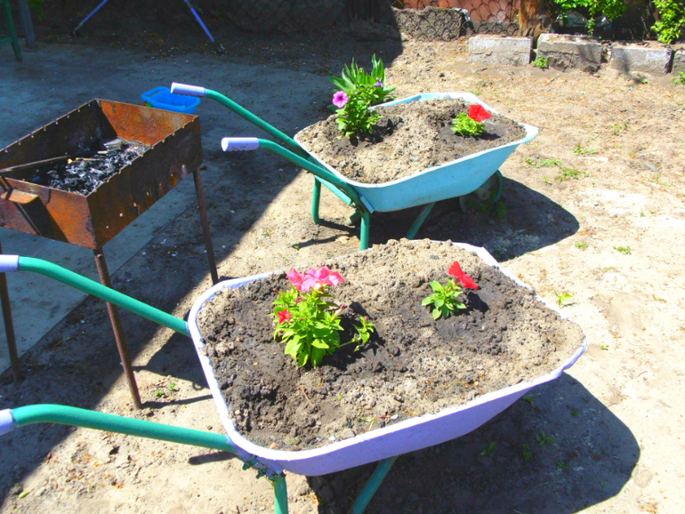 Пока строились 3 тачки угробили. Вот такое применение я им нашла. Сажаю в них петунию, когда разрастется будет очень красиво.