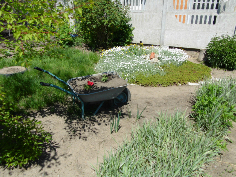 Плохо видно, там цветут внутри черные тюльпанчики. Раньше по-бокам цвели нарциссы, уже отцвели.