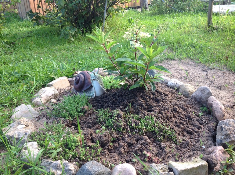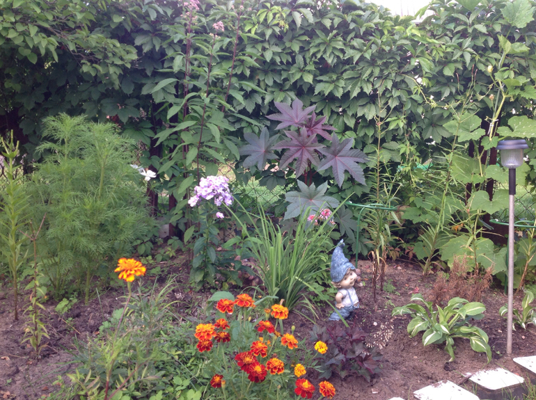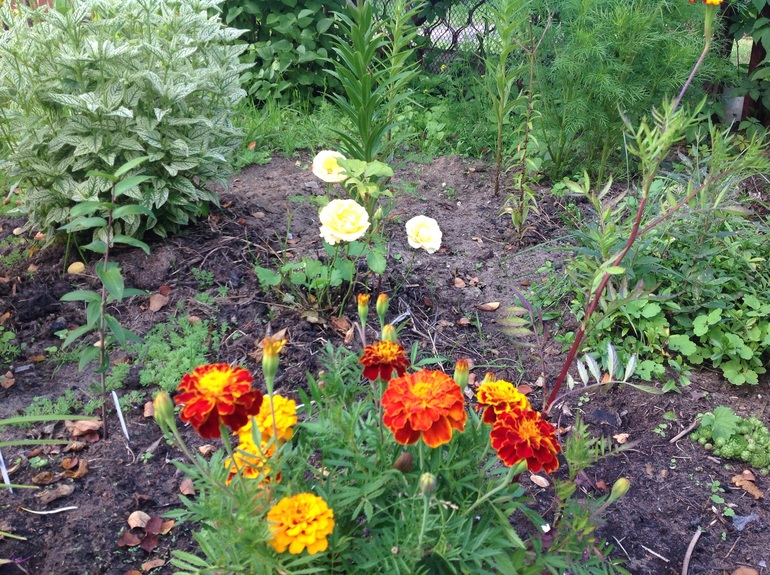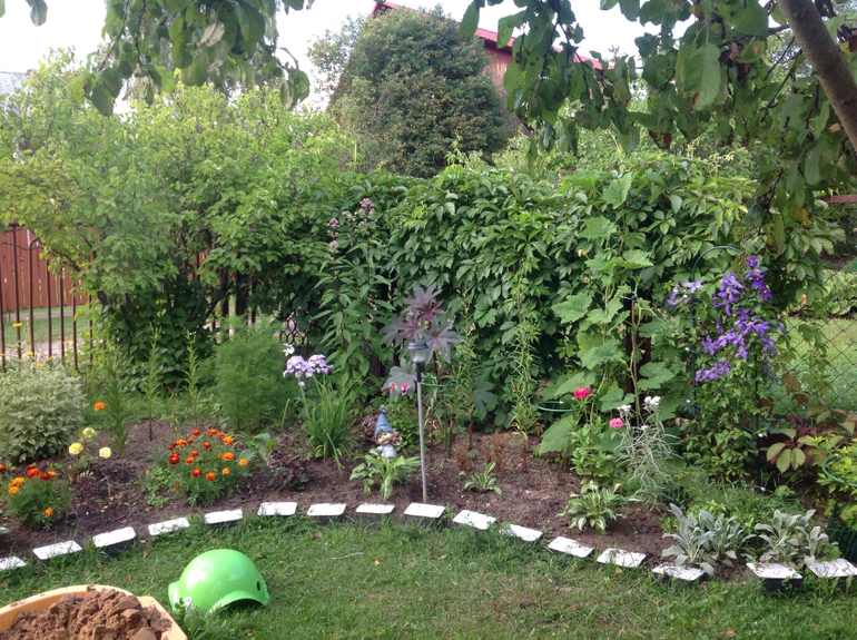 Ну и общий вид моей новой клумбы, которая в процессе... Поняла , что не так и хочу на следующий год к Клематису подсадить беленького братика, а то он совсем теряется в зелени... А еще догадалась " дыры" закрыть бархотцами, стало повеселее...