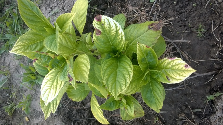 Гортензия, на ней коричнево-бордовые пятна и посередине дырочки как будто кто-то прогрыз. А еще листья какие-то светлые, может ей нужна подкормка?