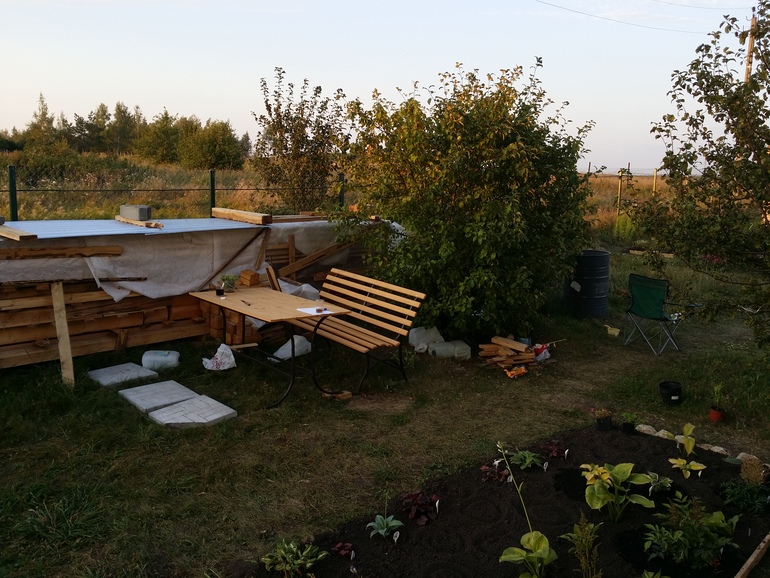 Вот фото и схема участка под миксбордер ( на строительный материал не обращайте внимания, скоро его там не будет.) размер 5.80*3.85 и скос к калитке. Входим в Калитку и проходим на участок между миксбордером и хостарием и двумя яблонями-дичками. Фото из окон дома. Буду очень благодарна за помощь!!