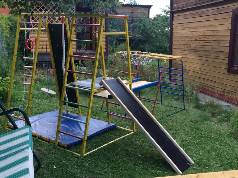 Тут и рукоход, и стена для скалолазания, и горка (я под нее в этом году бассейн еще планирую поставить. И место поменяю)