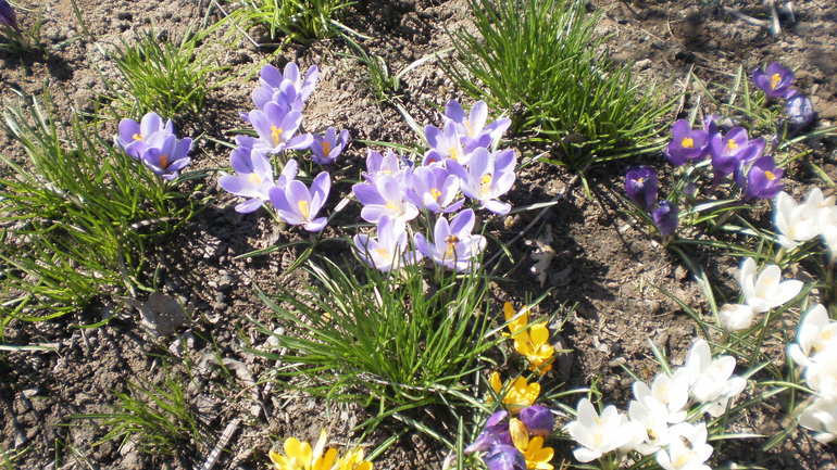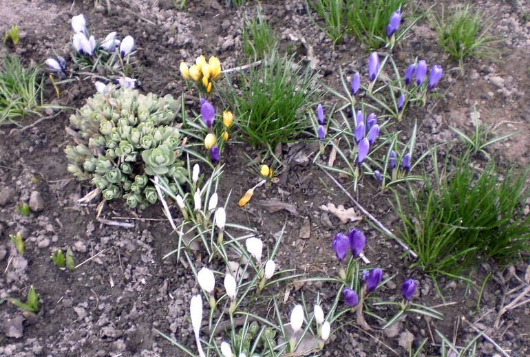 Многолетние цветыЛюблю крокусы. Они появляются самыми первыми из цветов. Только пригреет солнышко и они уже тут, как тут. Но при пасмурной погоде крокусы не распускаются, стоят, закрывшись - ждут погоды. У нас была какая-то непонятная погода, то дождь пойдет, то снег сорвется. Ветренно и холодно. А они , как стойкие оловянные солдатки в парадных мундирах. Ничего им не страшно. Глянешь на них и сердцу становится радостней.