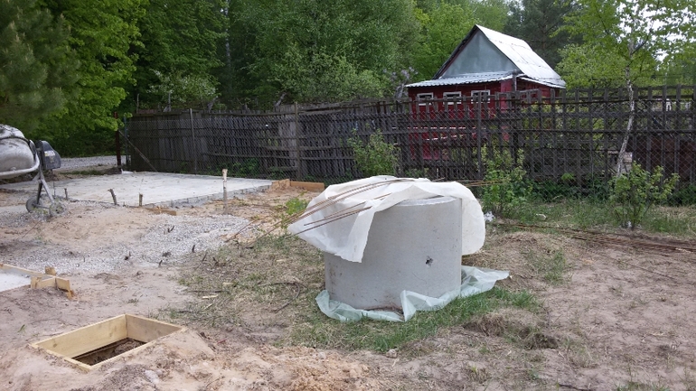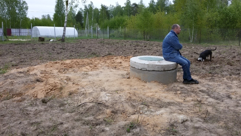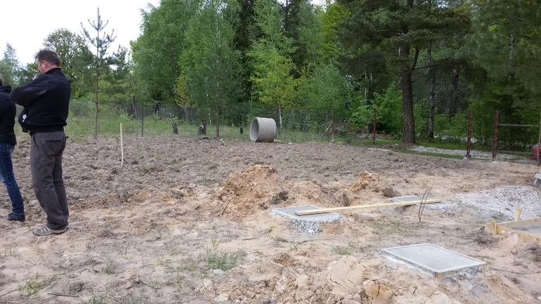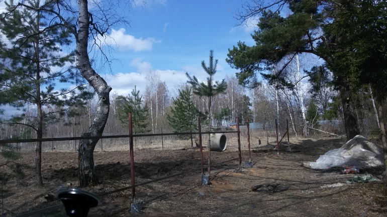 Сосны уже пересажены. Снимается грунт под залив фундамента под домик. Уже вырыты три колодца один посередине участка для воды, два других около дома- канализация.