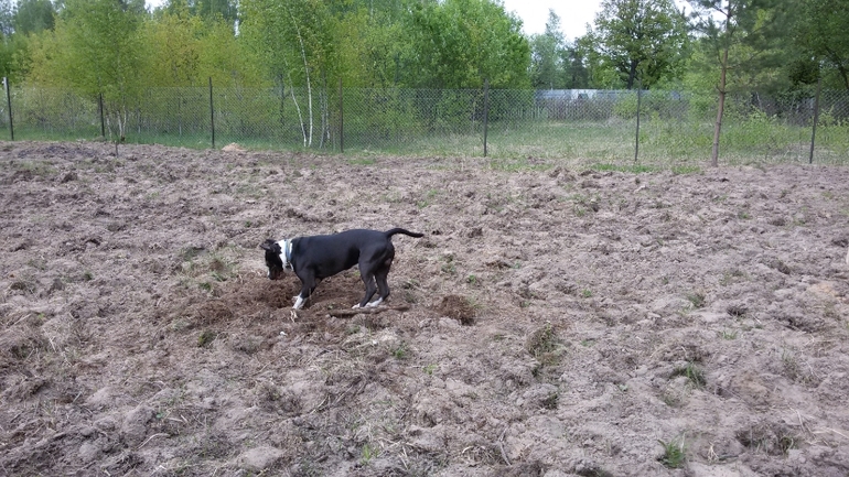 Это Норд, пёс друзей. он был просто очень счастлив!)))) носясь по участку, роя ямы и вытаскивая из земли палочки. Друзья сказали ,что таким довольным они его не ещё видели)))
