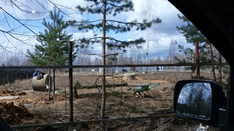 Четвёртый угол( ну вы поняли это я условно их обозначила)). Место под гараж. Будет чуть больше потом залито бетоном. За бетономешалкой сосна и ветки старой липы. Соседский домик и смородиновые кусты.