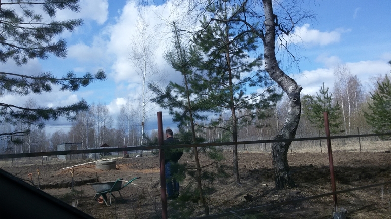 Третий угол. Две пересаженные сосны. В самом углу сирень и барбарис. Но их плохо видно. Вдоль сосен и чуть вперёд ко второму углу прокопаны ивы, помидор и лук. Планирован посадки пока нет смысла. Потому что муж хочет ещё большой дом во втором углу, следовательно, все затопчется. Пока он все засеял гречкой. Корни ещё осенью выкорчевали трактором. А сейчас перекопали в ручную.