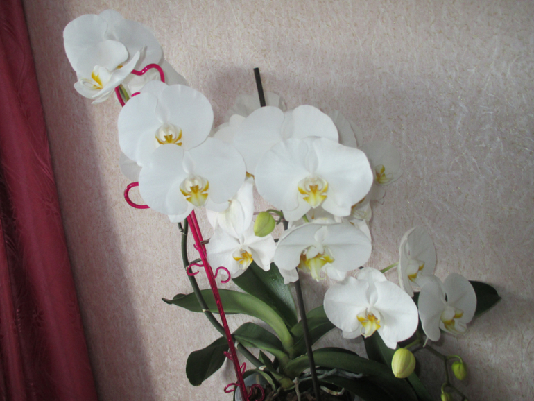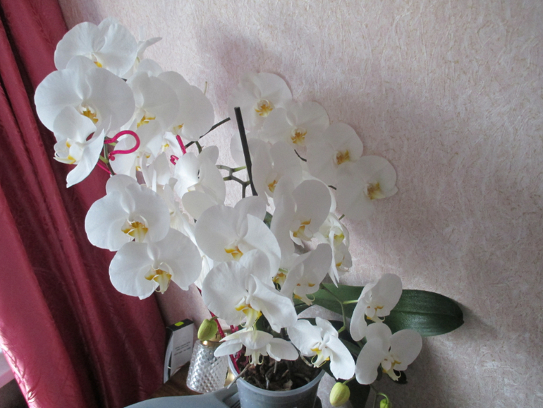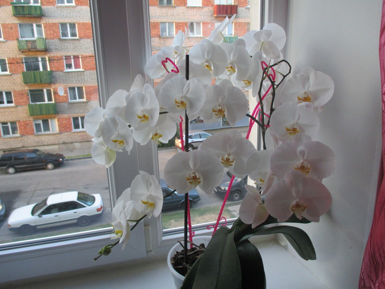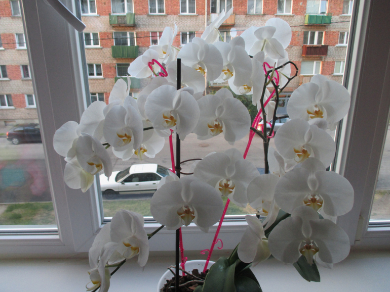Радует меня своим цветением орхидея,ей уже 4 года,на 4 цветоносах 38 цветков,и ещё не все распустились ,сам цветок 11- 12см,много фото.Она во всей красе!!!! Уход не сложный,орхидею поливать редко,иногда опрыскивать.Полив в тазик или мисочку наливаем воды ,ставим туда горшок и оставляем на 20-30 минут.Пересаживаю раз в год,покупаю специальный грунт для орхидей.Горшок должен быть прозрачный,я ещё делаю дырочки по бокам горшка много,спицу на огне нагреваю и дырочек много-много по всему горшку.Стоит на восточном окне,солнышко только рано утром,до 10-11часов,летом прикрываю от ожогов бумагой от солнца,может обжечь листики.Орхидеи не любят сквозняков и когда холодно на улице окно не открываю или уношу её,не любят ,чтобы их переставляли и поворачивали. Подкормка-удобрение жидкое Агрикола для орхидей,раз в месяц,зимой реже,когда цветёт чаще,раз в три недели.Кода жарко,то поливаю только в тазу чаще,смотрите на горшок ,если там капельки,то не надо,как просохнет ,тогда и поливать,а так опрыскивать.Можно проверить грунт полочкой от суши,если во ткнуть в грунт и она сухая,то поливать пора.Вроде все написала.
