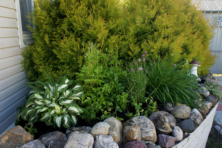 Между хостой и лилейником астильба, лук и другой лилейник.