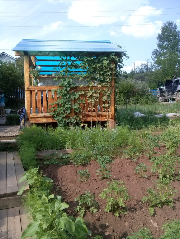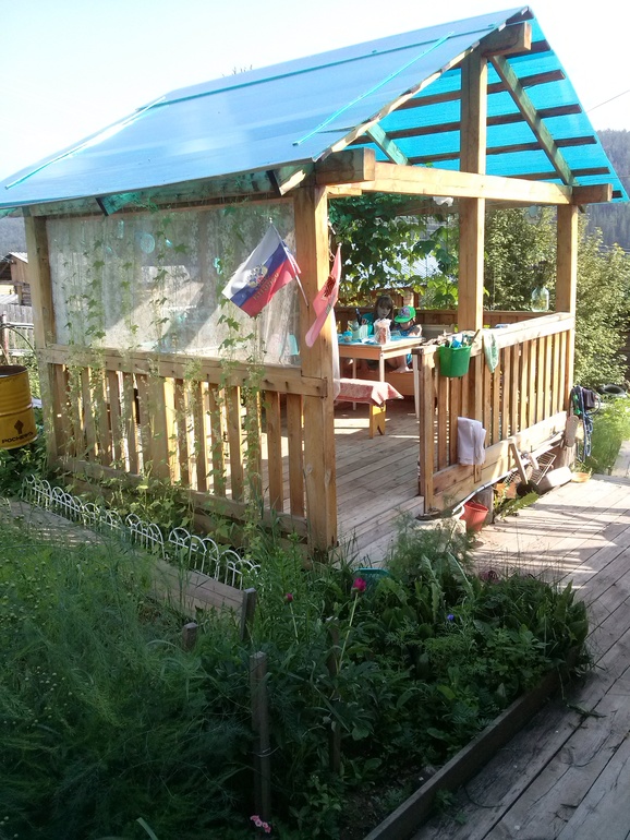 Это беседка, 3*3... летом мы в ней живем, там водопровод, раковина, электричество (розетки, пять плафонов по столбам), стол разделочный, гвоздики- полочки для посуды, двухкомфорку приношу из дома, обеденная зона, домой только ночевать ходим