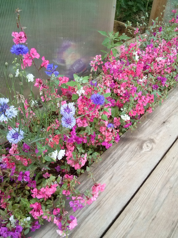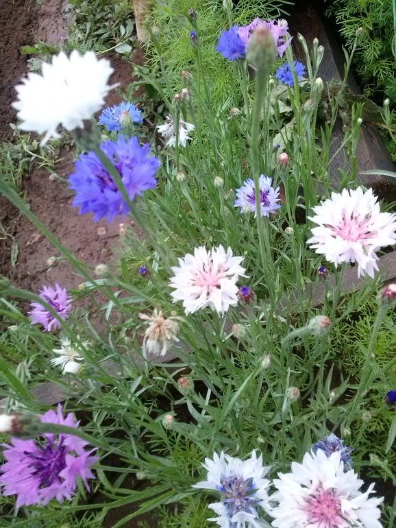 Еще есть крыжовник, смородина, малина по другую сторону, ирга, коптилка, огуречник. Два куста сирени у калитки, черемуха, облепиха. В цветочной грядке (их три, и по огороду сеются васильки и касмея) - пионы, лилии, флоксы, цинии, бархатцы. Две просто засеяны многолетками - васильками, кларкией, лаватерой, касмеей.