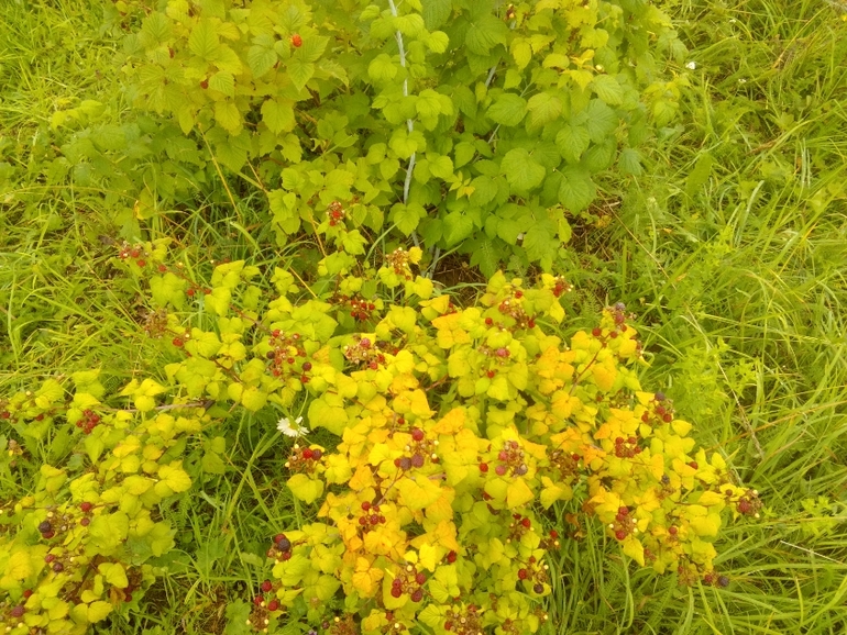 не, это не малина точно, ягоды черные, тут она оборанная - ягоды незрелые на фото. ягода чуть меньше малины, с более мелкими зернами, но более жесткие. на вкус похоже на чернику наверно больше всего.. причем она по тому как куст растет каждый год какая-то разная, первый год по земле ползла, второй год торчала, сейчас стоит вертикально