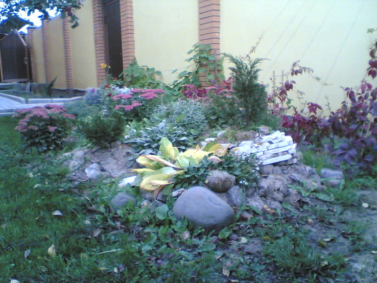 А теперь неудачная посадка. Альпийская горка. Сажала давно, все по правилам, с использованием камней, и т.д. что бы поднять уровень и первые пять лет она держалась, но теперь последние два года на ней вымерзает всё, хотя плодородной земли там очень много, но она вся смывается дождями. Это фото 2007 года. Здесь очиток, цинерария, можжевельник. Начало создания горки....