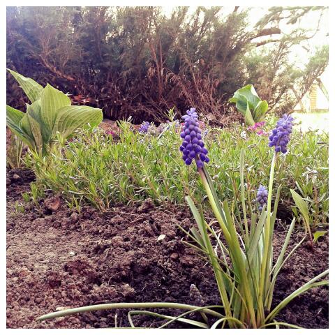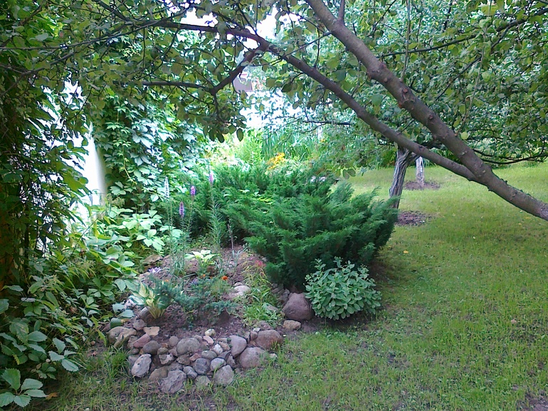 А здесь, мы сменили концепцию , и добавили карликовых флокосов (многолетников, и заменили на хосты темно-зеленые, которые больше любят полутень. Плюс еще гиацинт мышиный (его не водно за можжевельником так, что его фото отдельно и вблизи)