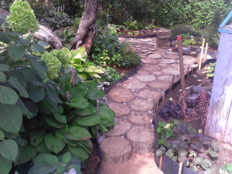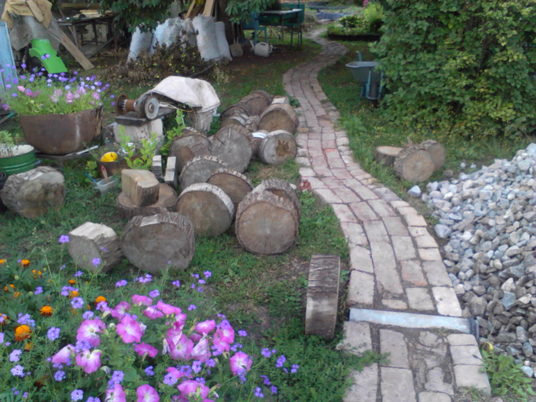 Делаем своими рукамиПродолжаем делать тропинки из спилов в теневой части сада. Клочок земли небольшой и так муторно было поддерживать чистоту.Косить неудобно не развернешься особо с тримером и трава из-за полутени растет как попало и какая попало. Пришла мысль отобрать огромные тюльки у домашних мужиков и порезать их на кругляши. Идея хорошая,но спилов оказалось мало.Так часть тропинки из спилов просуществовала год.В этом году сосед рассердился на липу и в ПОРЫВЕ ЧУВСТВ спилил ее. Вывез далеко к лесу,чтобы жена не видела....хаха! Будто обрубки дерева и его отсутствие она не заметит. В итоге он порезал его и привез мне. Радости было полные штаны!!! быстро напилили,пропитали,положили....но!!! снова не хватает((( к счастью племянницы с друзьями обнаружили на дороге кругляши,видимо техника колхозная не могла по осени выехать и под колеса кидали. Не долго думая, все это добро уже лежало у меня в саду!!! С какой радостью мы отмывали их от глины,сушили,пропитывали. Теперь надеюсь хватит.