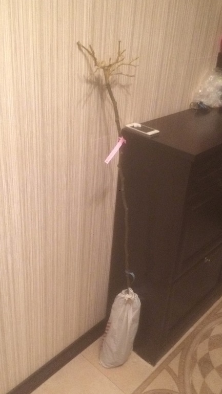 Поставьте в прохладное место,т.к. почки еще спят, не стоит пересаживать в горшок и ставить на окно. Скоро уже в сад посадите,я думаю через 2-3 недели...