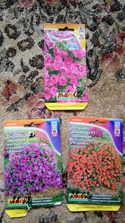 Внизу посмотрите фото семян. Справа - это джоконда неоновые. Но цвет как-то с картинкой на пакетике не совпадает. А слева ампельные должны быть по 45 см.