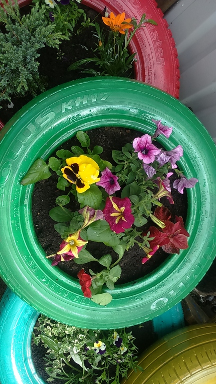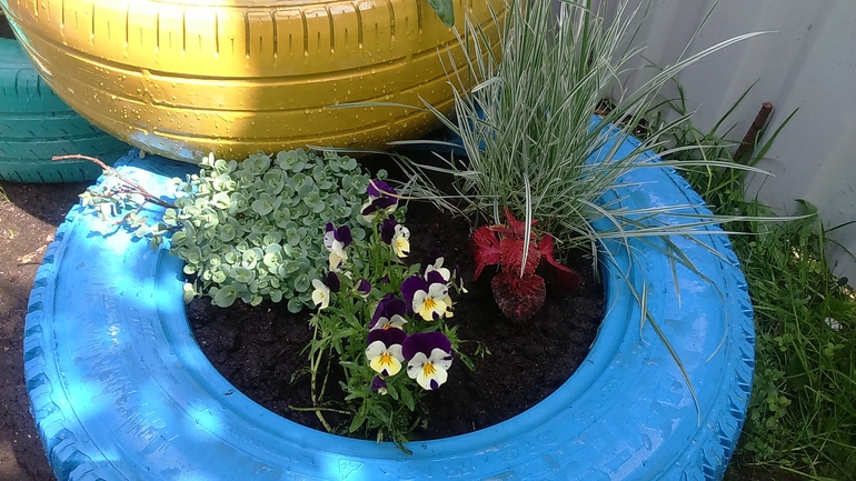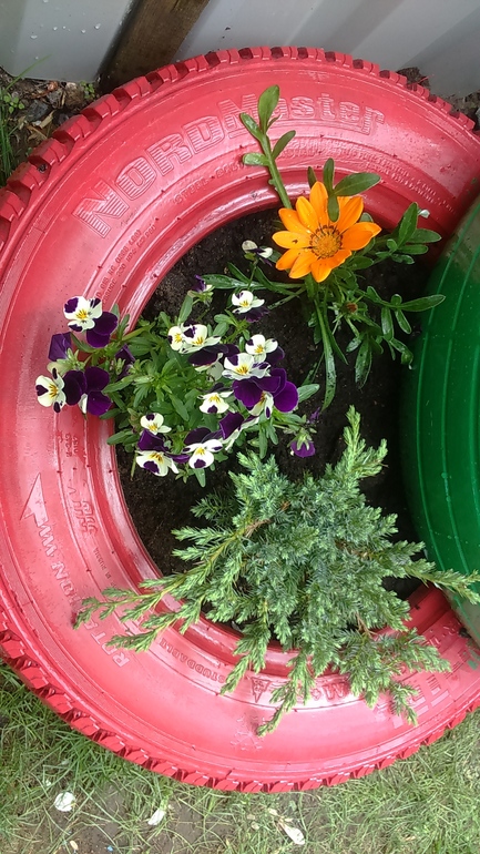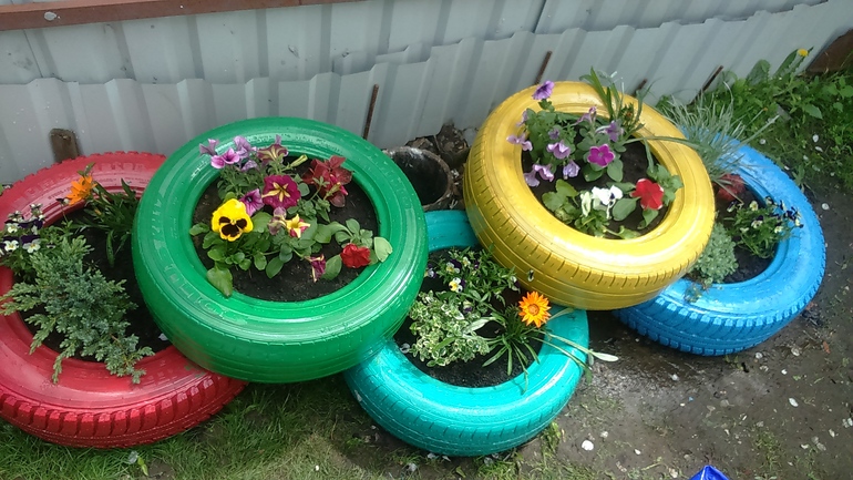 Хвалюсь, мой участок.Загорелось мне весной сделать клумбу из автопокрышек. Благо сосед в гараже мелким ремонтом занимается, у него этого добра хватает))