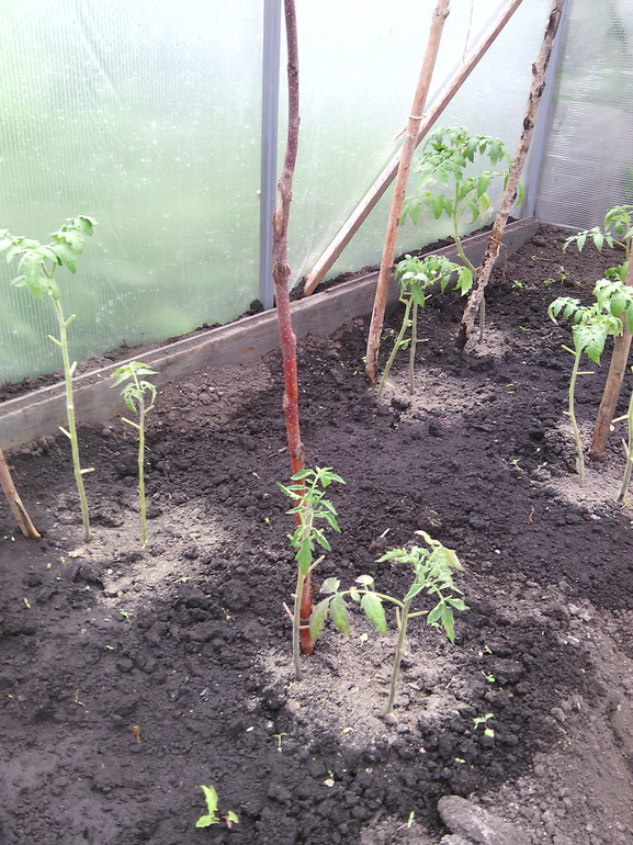 И недоразумение теплицы. То ли место неудачное, то ли болеют томаты, то ли сорт такой. Они еще подмерзли в мае, когда минус был, так путем не оклемались. В общем, стоят лысые, не цветут даже. Сорт 2-х метровый, но они не растут(((