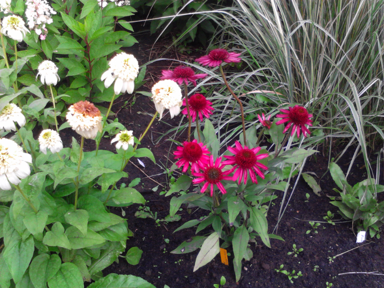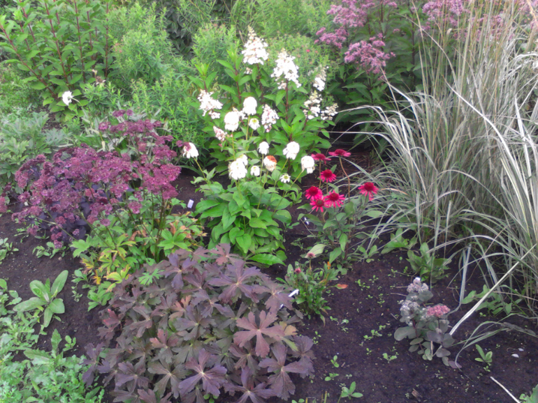 слева посажены очиток видный Black Jack, астранция Кларет и справа сорт эхинации ярко-алого цвета, имя не вспомню сейчас.По середине герань с бордово-каштановыми листьями.На последнем фото брунера новый гигантский сорт Alexander's Great.