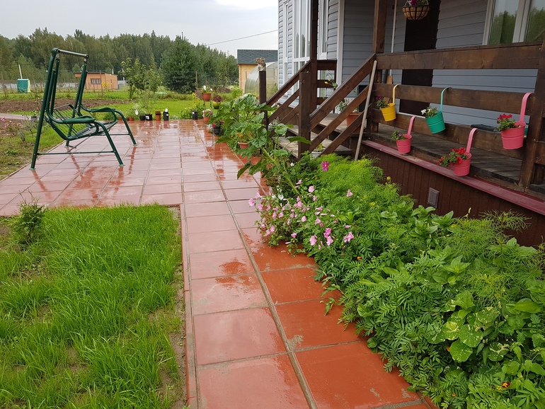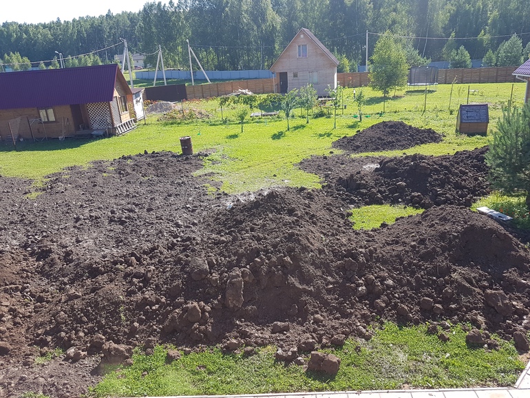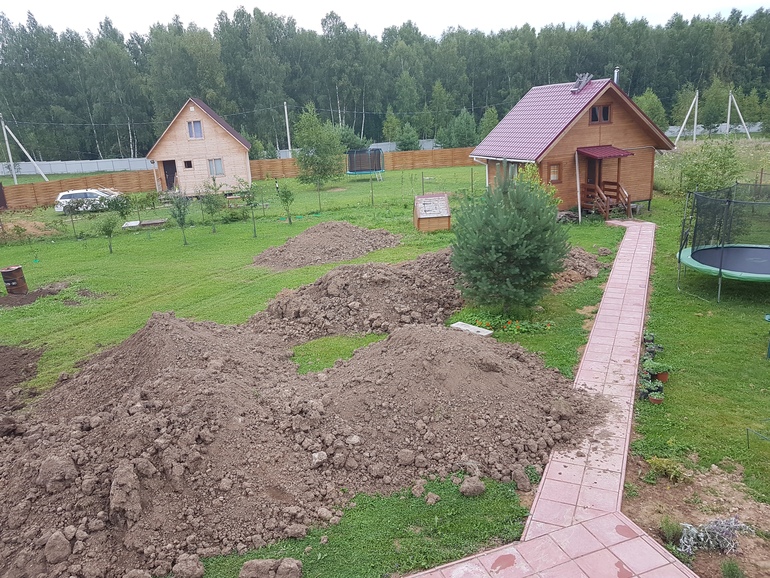 Было у нас и так. Проложили дорожки...но халтурщики узбеки бордюры сделали слишком высоко. Решено было завезти земли. Как раз и участок разровнять. Итого на привезли 17 машин.