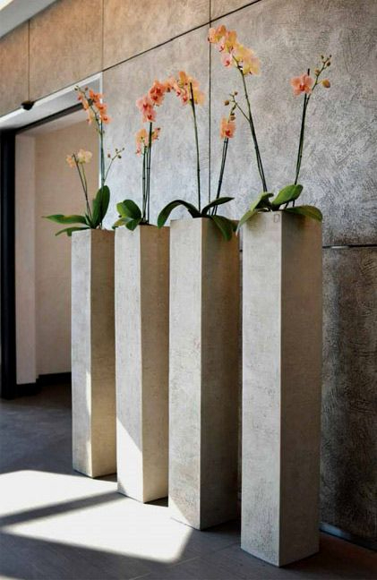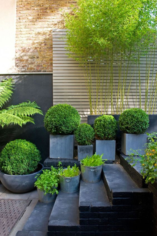 Как располагать? Тут тоже возможны варианты. Это может быть разномастная по цветам, размерам и материалам группа, может быть строгий ряд из одинаковых кадок, а может быть и акцентное кашпо в единственном экземпляре. Главное тут уместность! Композиция должна соответствовать стилю, располагаться в таком месте, где будет наилучший обзор (крупные кашпо подальше от зрителя, мелкие - ближе, рассчитать, кто будет смотреть: сидящий человек или идущий, со скольких точек будет видно), должна быть рассчитана на весь сезон (растения с непрерывной декоративностью). Заранее надо предусмотреть место для зимнего хранения кадок и растений. Если кадки выполнены из подходящих материалов, можно их оставить и на улице, но тут надо также продумать, как будет смотреться композиция без растений. Или украсить инертными материалами или ветками хвойных растений - в новогодние праздники это будет очень актуально.