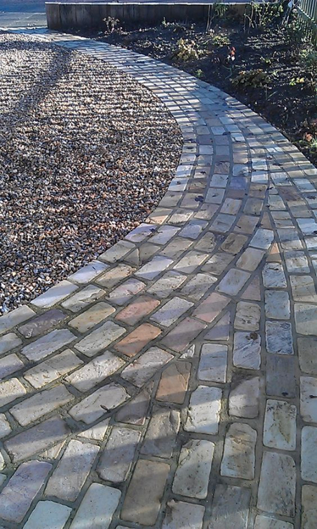 Но это теория. А теперь практика. Подбираем брусчатку и "раскладываем" ее по всем площадям мощения. И тут может выясниться, что ширина дорожки должна быть побольше, чтобы не пришлось подпиливать плитку... Не забываем про швы!