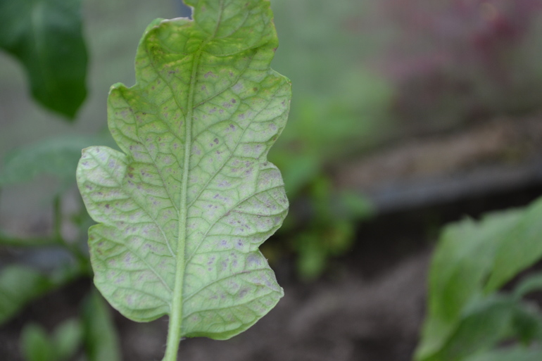 Если только нижние листы такие, а новые, которые отрасли после высадки нормальные, то скорее всего это так сгорели листы, не приученные к ультрафиолету или реакция на холод, стресс... На форумхаусе выкладывали один в один фото и все сошлись во мнении, что это не болезнь (при условии, что остальные листья нормальные)