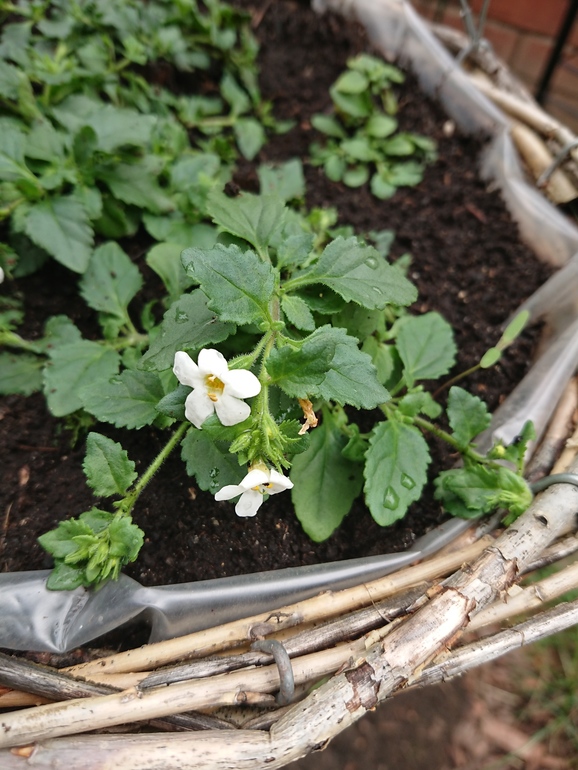 В плетеных кашпо петунья (когда уже зацветет!?) и бакопа (собственного выращивания)))).