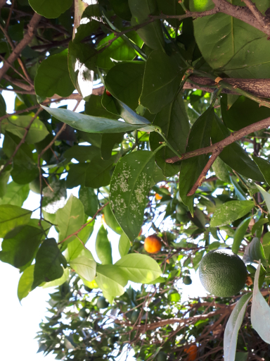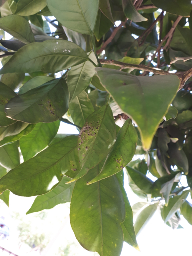 На апельсиновом дереве на некоторых листочках с внешней стороны -- как будто пыльный налёт или сажа,