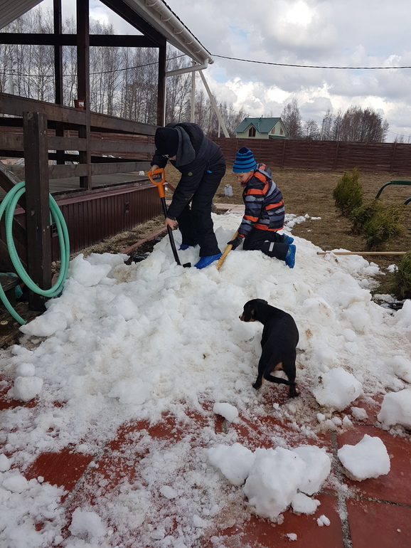 Снега на участке не было практически. Только возле крыльца. Там с крыши падает. Но мы с этим ооочень быстро справились.