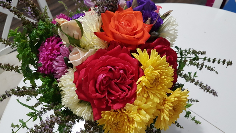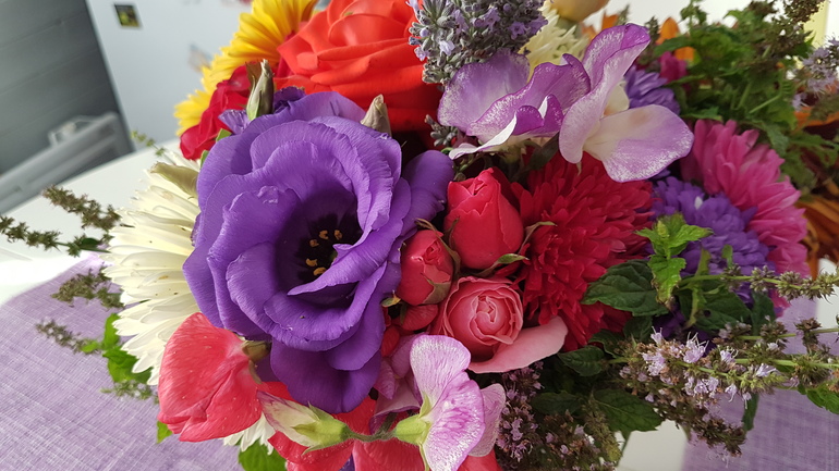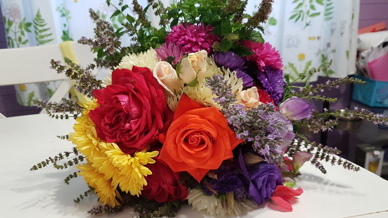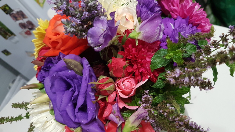 Этот букет стоит у меня уже 2 недели. эустома как новая, хризантема с астрами тоже....красота!)