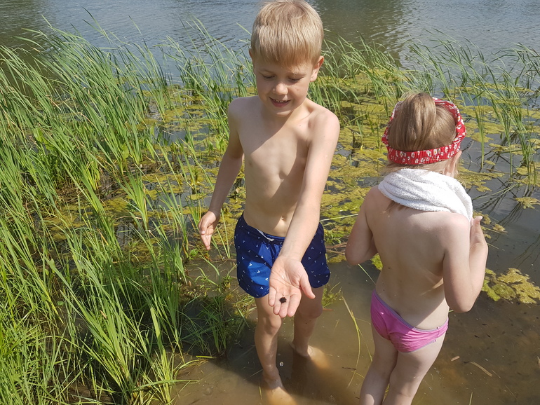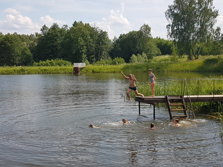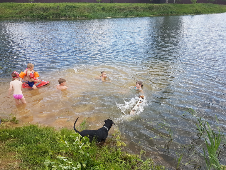 Погода была шикарно теплая и в конце мая мы уже открыли купальный сезон. У нас есть пруд который выкапывался специально для нашего поселка и если честно я там побаивалась купаться из за глубины и глинистого дна. Хоть песок каждый год и подсыпают. Но жара сделала свое дело и мы туда ходили всей толпой.