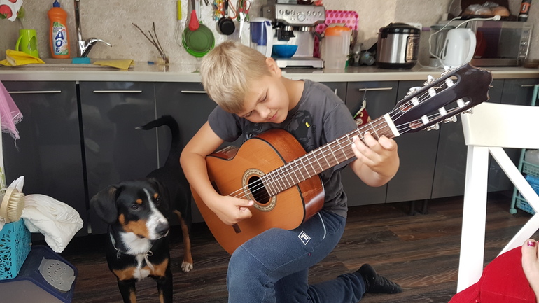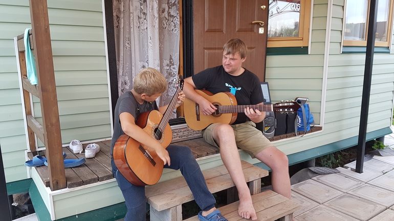 Данька давно хотел научится играть на гитаре. В итоге купили ему гитару и он ходил к местному учителю 3 раза в неделю. Ему нравилось.