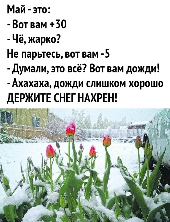 у нас снега в мае не было, 13 мая температура 1 раз упала ночью до нуля, был иней. у нас практически каждый день 30, холодает до 20 дня на 2, а потом опять 30. в этом году аномально жарко в сибири.