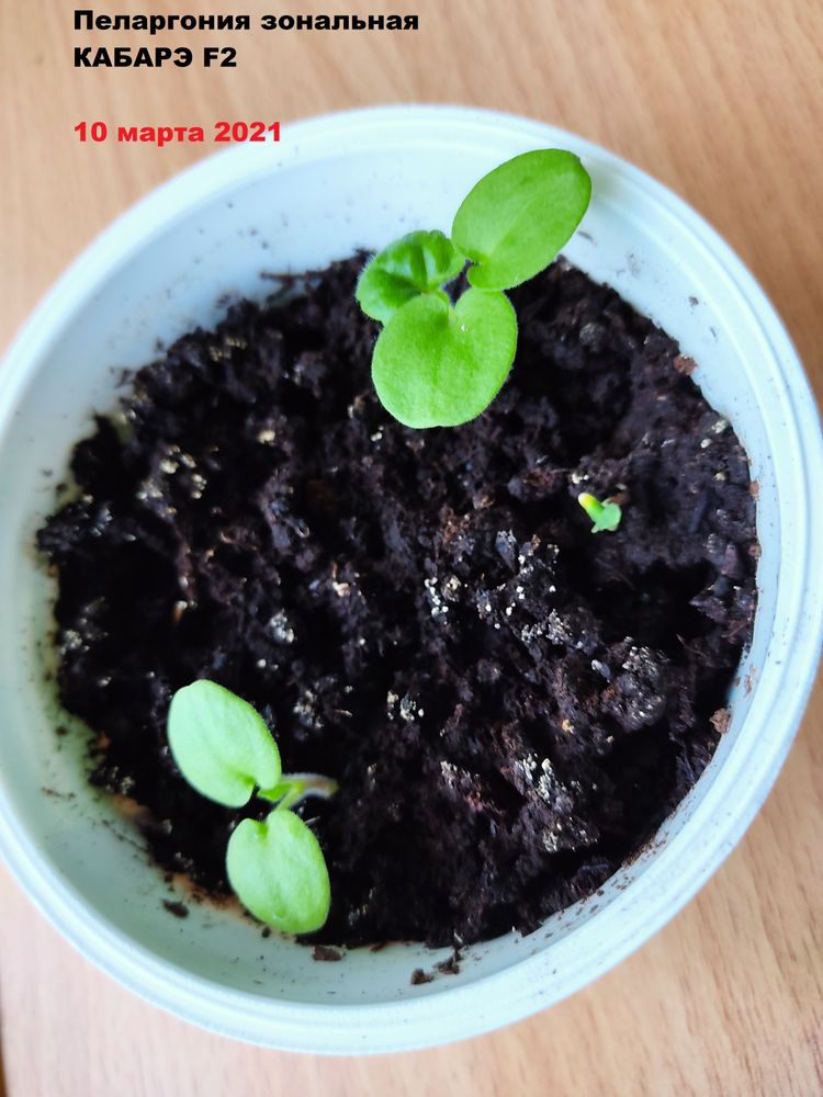 У пеларгонии Кабарэ взошли 3 росточка из 5 семян. Из них два активно пустились в рост, проклюнулись даже первые настоящие листочки. Один росточек изначально выходит кривоватый, поэтому запаздывает за соседями по горшку. Думается, растение из него получится слабоватое. Ну посмотрим)))