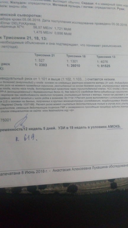 Здравствуйте. Сделала в 12 недель скрининг и теперь места себе не нахожу, мой врач нечего не говорит. Может вы подскажите есть ли риск трисомии 13 у моего малыша?