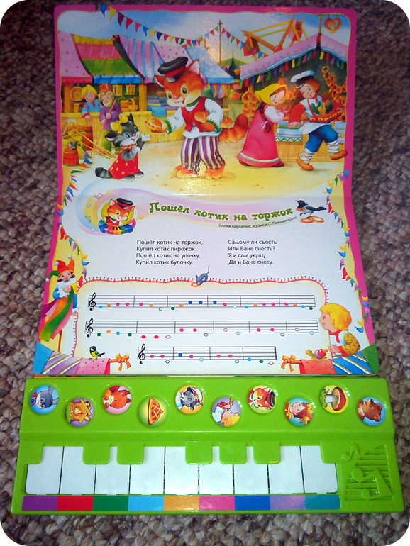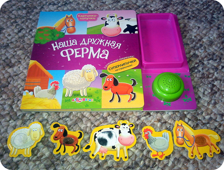 Про яркость картинок говорить в 100500 раз бесмысленно, на мой взгляд, у книг азбукварика самые красочные картинки. Но странички здесь не картонные, обычные, но плотные. У нас есть все книги этой серии, именно здесь странички чуть плотнее, чем в предыдущих книгах этой серии. Озвучивание отличное. Но нам как то пока не захотелось слушать, песенки и Чуковского с удовольствием, а стихи не пошли пока, но странички листаем и с радостью рассматриваем.