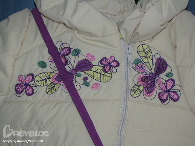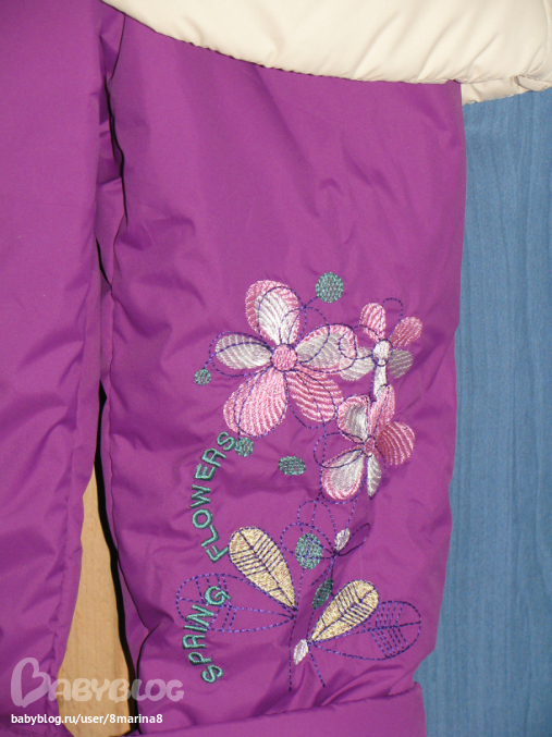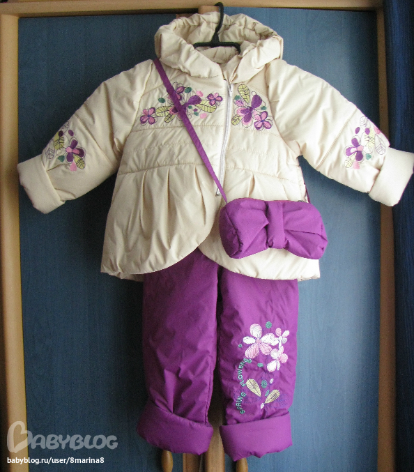 Куртка с капюшоном. Сумочка идет в комплекте. На курточке и брюках вышивка - цветы. Рост регулируется подворотами.