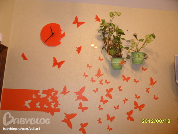 Просто слева холодильник (из-за него не выпустишь бабочек), справа окно... Пришлось так расположить. А дополнительных бабочек я повесила на холодильник, напротив часов))